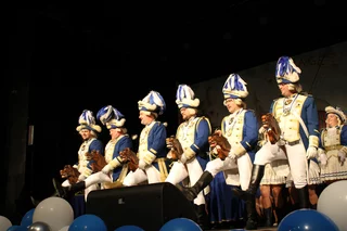 Das Tanzcorps Fidele Sandhasen e.V. aus Troisdorf. Man konnte froh sein, dass eine große Bühne zur Verfügung stand, denn diese wurde von den Sandhasen gefüllt. Der Kommandant dieser Truppe verkündete, dass es die ersten neuen Tänze dieser Session seien und somit das hier die Primäre sei. Eine fantastische Tanzgarde, die den Gästen im Saal hervorragende Tänze vorführten.