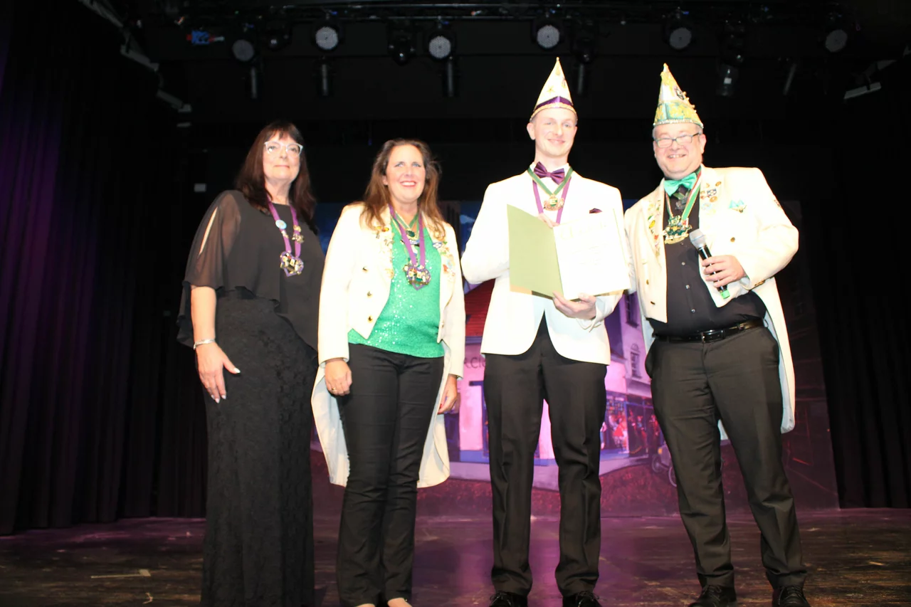 Nun kam die neue erste Vorsitzende Angelique di Marino auf die Bühne und holte sich den Präsidenten Tim herbei. Lieber Tim, du als unser Sitzungspräsident, der mit 19 Jahren in den Verein eingetreten ist und jetzt schon zum 11. Mal als Sitzungspräsident die Sitzung leitest, als jüngster Präsident in Nettetal, und weil du nicht zu ersetzen bist, erhältst du den SKG, den höchsten Verdienstorden der Gesellschaft. Tim van Overbrüggen hatte in dem Moment die Tränen in den Augen stehen.