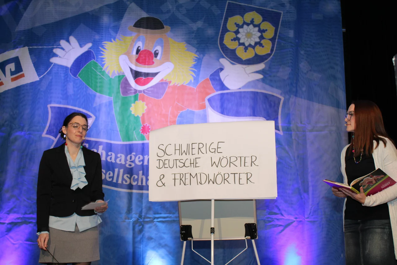 Nach diesem Auftritt erfolgte ein Gespräch auf der Bühne. Es waren zwei Studierte ohne Ahnung. Sie hatten in den letzten Jahren Probleme mit der Aussprache gehabt, mit Wörtern, die sie vorsagten und das Publikum nachsprechen sollte. Das Wort hieß Zucchini,Lassogons,Lachs,Cornichon,Synthesizer,Vernissage usw. Und das Publikum hatte damit ihren Spaß. Die zwei Studierten ohne Ahnung waren Nadine Friedrichs und Dominique Stappmanns.